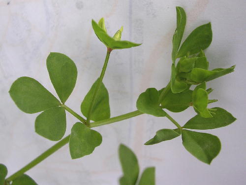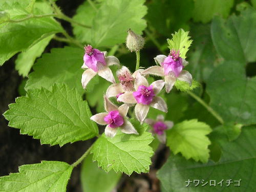 花は紅紫色で枝先や葉のわきに2〜3個ずつつき、