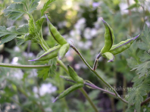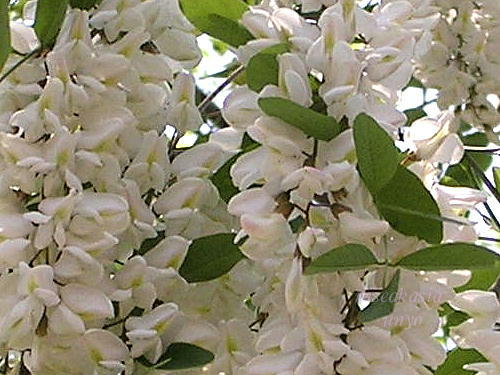 花は白色の蝶形で、長さ約2cm。多数が葉のわきに集まり、長さ10〜15cmの総状花序になる。