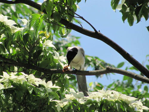そのヤマボウシの樹に鳥がなにかをくわえてやってきた