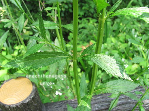 葉は互生し、長さ1.5cmほどの円形または卵形で、ふちには浅い鋸歯があり、基部はハート形で茎を抱いている。
