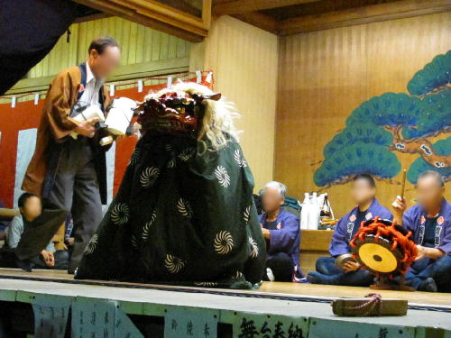 では、テレツクテンテッと調子の良いお囃子の太鼓の音と 見事な獅子舞を眺めつつ