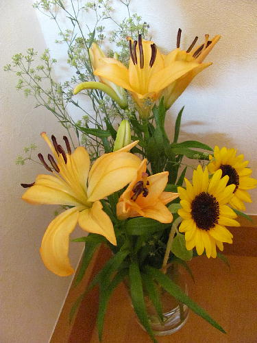 夏といえば向日葵、その向日葵と色的に同じアジアンティック・ハイブリッド系のユリを一緒に生けてみました